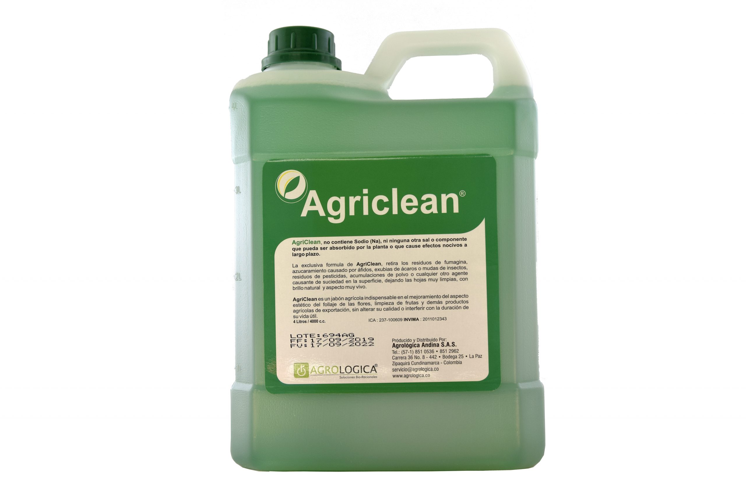 Agriclean es un jabón agrícola diseñado para mejorar el aspecto del follaje en cultivos hortícolas, frutales y ornamentales, eliminando exuvias, telarañas, residuos azucarados (fumagina) producidos por ácaros, mosca blanca o áfidos y residuos como polvo del ambiente o de aplicaciones de plaguicidas y fertilizantes, al ser un jabón NO IÓNICO es totalmente compatible con insumos agrícolas, solo o en mezcla si alterar la calidad de los cultivos. Los componentes de Agriclean degradan y hacen permeable la cutícula de los artrópodos plaga, optimizando la eficacia de herramientas complementarias de control químico ó biológico.